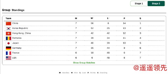 在第二阶段循环赛前3日中,中国队先后以8-1、8-4、8-0和8-2战胜德国队、韩国队、中国香港队和日本队,豪取7连胜。