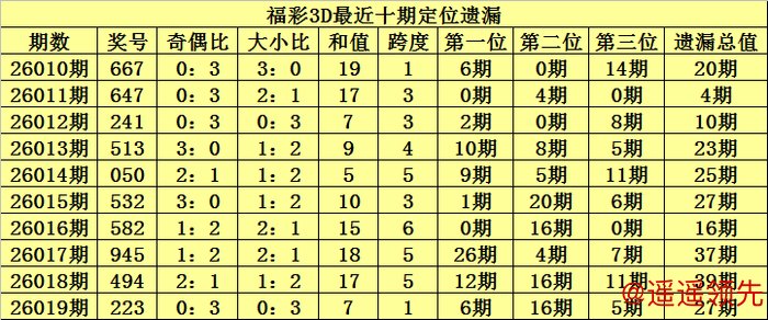 开奖回顾:福彩3D第2026019期奖号:223,百位号码遗漏6期、十位号码遗漏16期、个位号码遗漏5期,遗漏总值为27期。