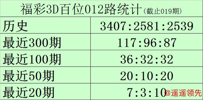 百位推荐:百位最近20期号码012路比为7:3:10,目前0路号码遗漏2期,1路号码遗漏1期,2路号码遗漏0期,另外0-9号码遗漏期数分别为: