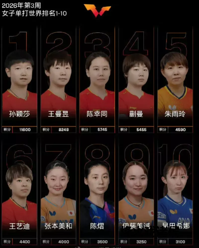 2026年1月13日WTT 第3周排行发布,孙颖莎已攀附保执女单寰宇第一头衔长达183周,且以11600分断层卓越第二名王曼昱3352分。