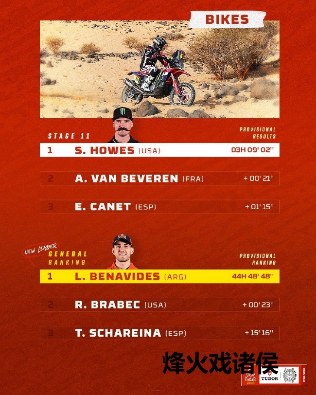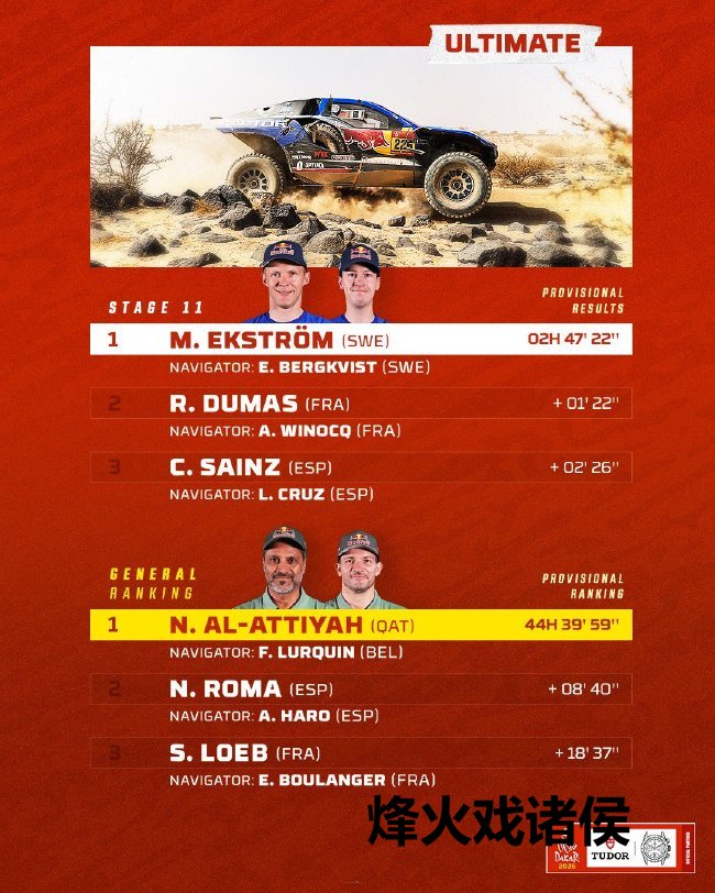 马蒂亚斯·埃克斯特罗姆(Mattias Ekstrom)以最短完赛时刻冲过尽头线。这位瑞典车手赢得了他在达喀尔拉力赛的第八个赛段冠军,亦然他本年的第三个赛段冠军。取得第二位,驾驶客户车队RD LIMITED福特赛车的罗曼·杜马(Romain Dumas)也刷新了我方达喀尔拉力赛事业生存的最好收获。第三位由赛恩斯取得。