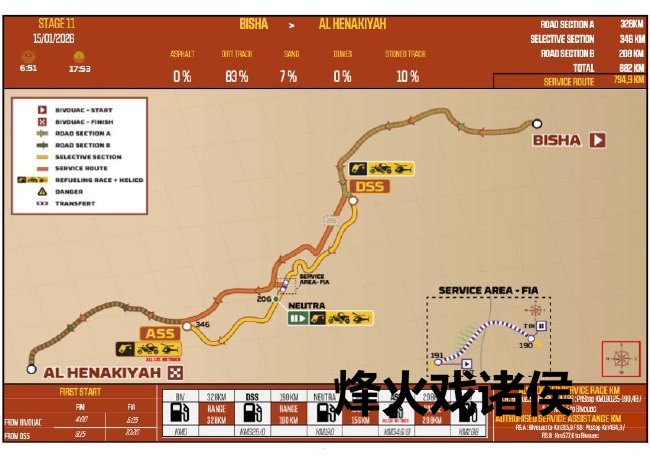 第11赛段,从比沙赶赴阿尔赫纳基亚。346km的计时赛段是本届达喀尔拉力赛平均时速最快的赛段,但歧路的数目广博,路况很容易变得犬牙交错。